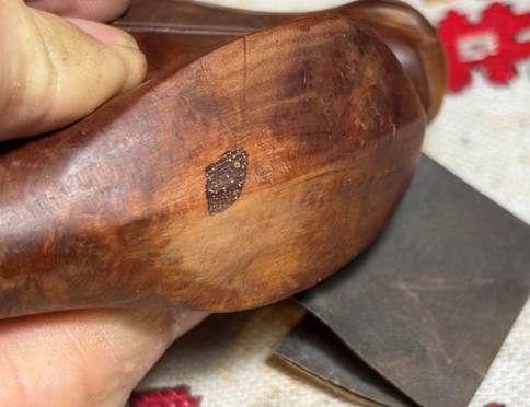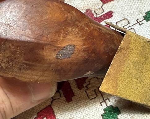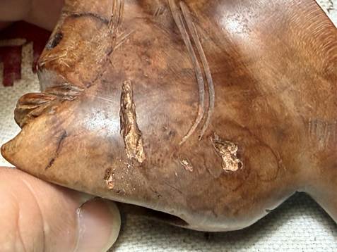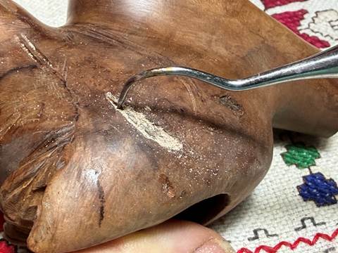 My hat is off to the Marxman sculptures for the fill material that was used. While the fills have retracted so that they are no longer flush with the briar surface, they are as hard as a rock. I wish I knew what was used in the Marxman shop. The fill material appears to be a powder based filler and the advantage of powder based fillers is that they will more readily absorb the newly applied dye and not stand out. The downside is that they are usually not waterproof and will dissolve if they get wet. This, at least, has been my experience experimenting with different filler options. The digging is done with both a pointed dental probe and the sharp end of the small dental spoon.