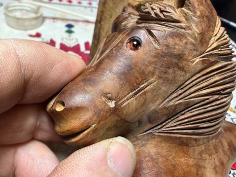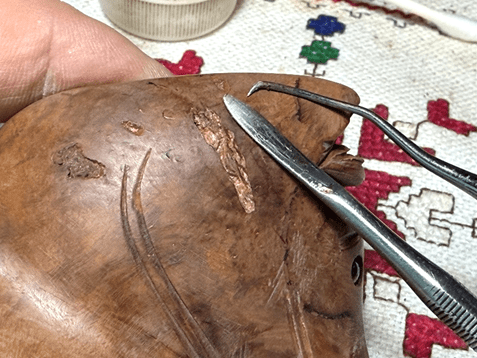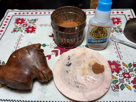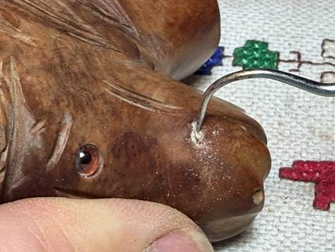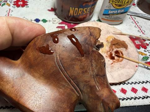 The toothpick is used to trowel the briar putty to the hole and filling it. The first batch of briar putty is enough to fill the 4 holes on the side of his head. After a hole has been filled, the patch is sprayed with an accelerator to hold the patch in place so I can continue to work on the next fill. The accelerator also quickens the curing process.