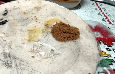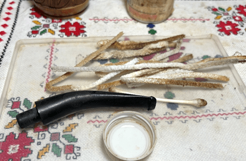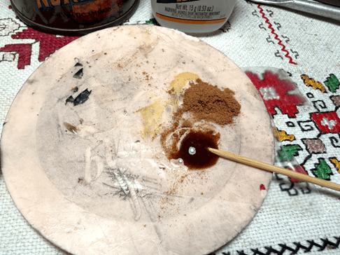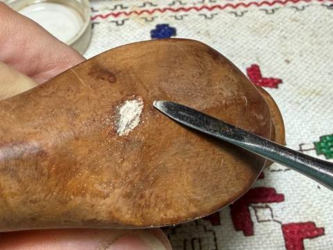 A toothpick is used to draw the dust into the glue, and it is mixed. More dust is drawn in and mixed to thicken the briar putty. When it thickens to the point that it will ball up on the end of the toothpick as the toothpick is rolled is when it’s about ready to go. If it thickens too much with the dust, some kind of a chemical reaction happens, and it will smoke and harden immediately. I try to avoid this.