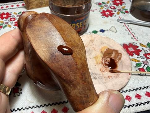Another batch of briar putty is made and the rest of the holes are filled with putty. To make sure the patches are thoroughly cured, the stummel is set to the side for a time.