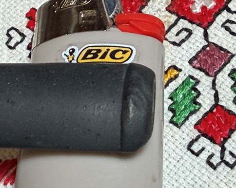 Both the upper and lower bit have light tooth chatter and compressions on the button lips. To attempt to lessen the compressions on the button the heating method is used. Both the upper and lower bit are painted with the flame of a Bic lighter. The flame is moved back and forth rapidly so as to not scorch the rubber. As the rubber heats it tends to expand helping it to minimize the compressions. The heating has helped some, but the compressions are still present on the upper:
