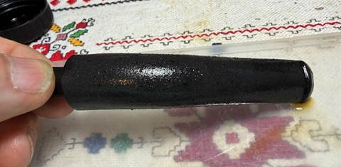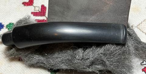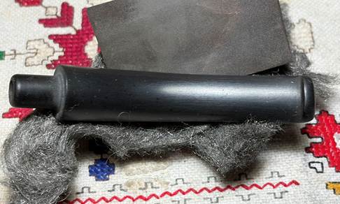 The stem has been soaking in Briarville’s Pipe Stem Oxidation Remover. After fishing it out of the fluid, a picture shows the roughness of the surface. The vulcanite surface is then rubbed rigorously with a cotton cloth to remove the raised oxidation.