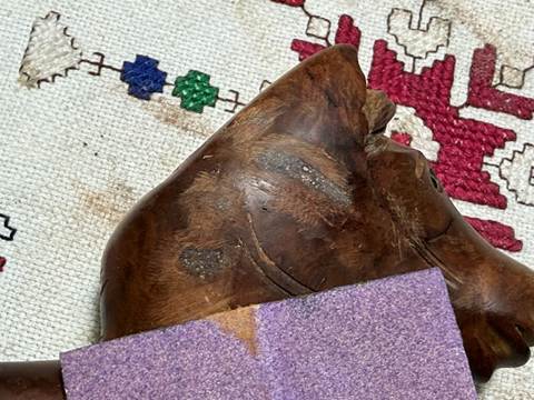 After the felt wheel, a softer cotton cloth wheel is mounted and again applies another round of Brown Tripoli compound. The reason for this is to continue removing excess dye but also to fine tune the grain presentation. It becomes even sharper with the second go around with the cotton wheel. The final reason is that the cotton wheel is able to reach the very tight areas like beneath the chin and into all the many grooves described above.