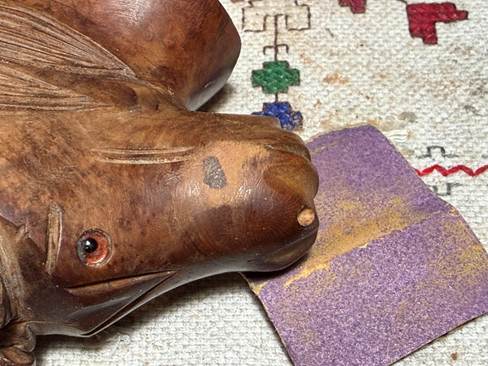 This picture gives an idea of the unwrapping contrast. I’m pleased with the way the Mahogany dye has masked the huge fills – they easily could have been more noticeable. The process took a good bit of time as I had to get into the sculpted grooves forming the mane, around the ears, mouth and accent lines.