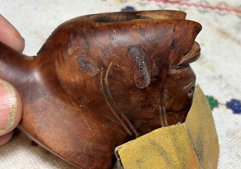 The surface of the Horse is rough and there are a lot of blemishes. The entire stummel is next sanded with sanding sponges. Five sponges are used starting with grades very coarse, coarse, medium, light and fine. The briar cleaned up nicely.
