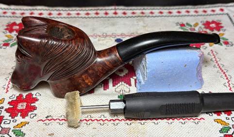 The next morning it’s time to ‘unwrap’ the newly dyed Horse stummel. I allow the new dye to settle for several hours to help prevent leaching later on when the pipe is put into service and heated up. With a coarse felt buffing wheel mounted on the rotary tool with the speed at about 50% full power, Brown Tripoli, a more abrasive compound, is applied to the stummel. The combination of the felt wheel and Tripoli does the main ‘plowing’ to remove the flamed dye crust to reveal the grain beneath.