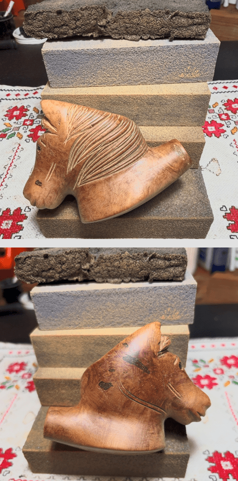 I have to say honestly that this 1940s/early 1950s Marxman Large Horse Figural turned out better than expected. Marxman is not known for the quality of briar used and this stummel was a good example of briar that needed a good bit of help. The Mahogany dye did a great job masking the large fills and popping out the grain. If one goes looking for the fills, they can be found, but these rough spots will be his badge of honor as he begins serving a new steward. One other thing I believe that helped this Horse – softening the bend of the stem. The general rule of thumb is that the end of the stem should be parallel with the rim plane. For me, the shape of the head is in a much better orientation with the bend softened. Richard commissioned this pipe and will have the first opportunity to claim him from the Pipe Store. A portion of the proceeds of all pipes restored go to help The Daughters of Bulgaria, now called Spring of Hope – helping women and girls who have been trafficked and sexually exploited and developing prevention programs for those most vulnerable. A ‘before’ picture helps us remember how far we’ve come. Thanks for joining me!