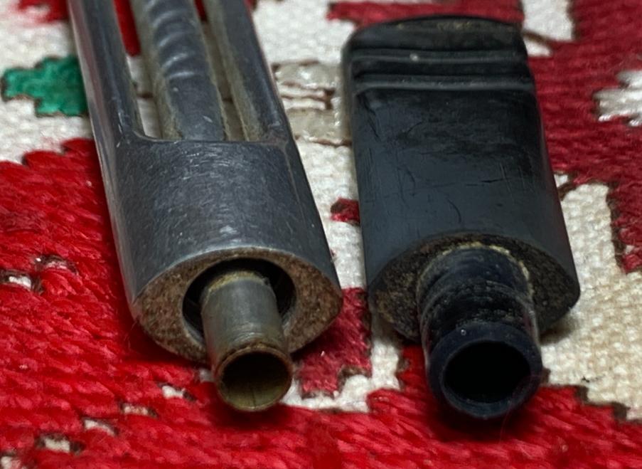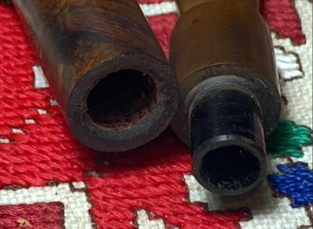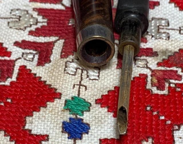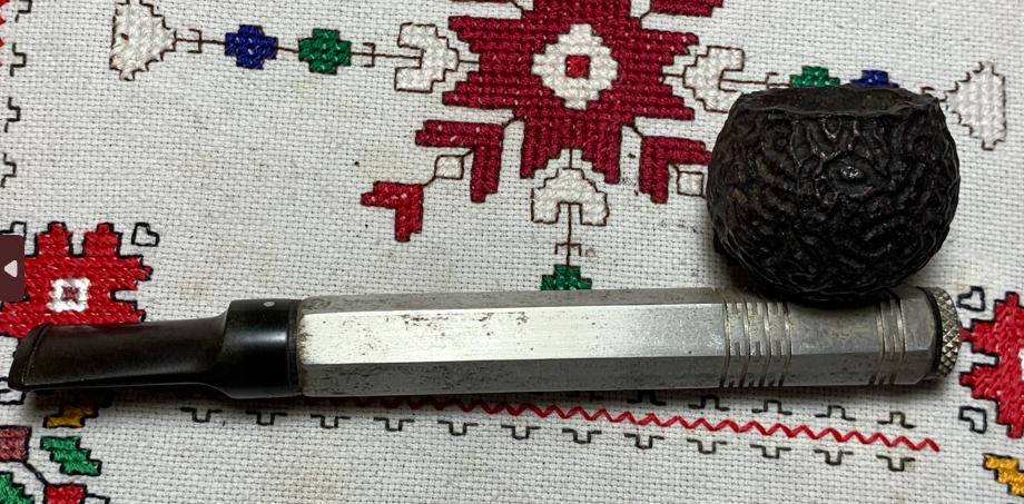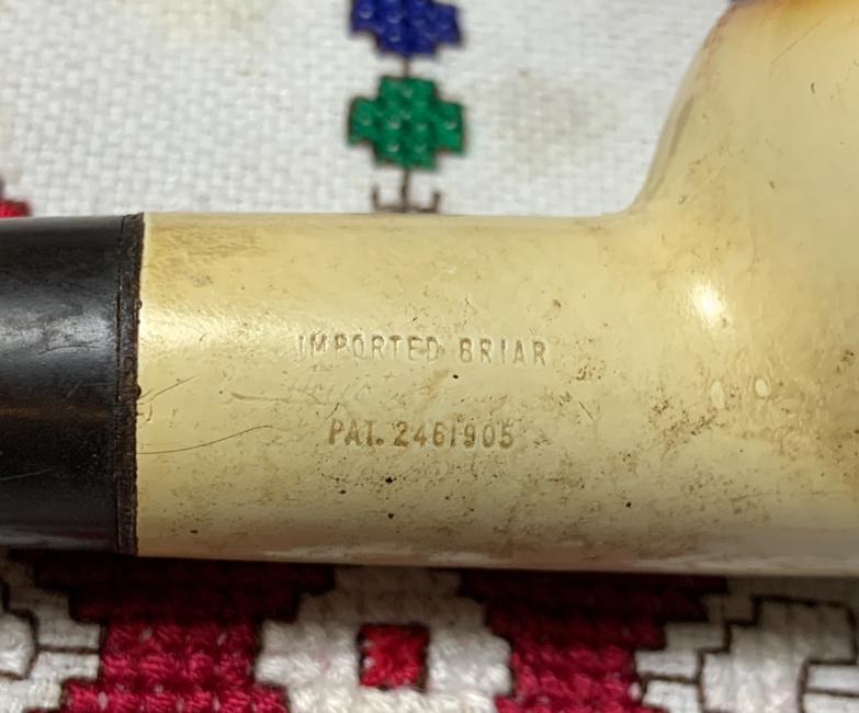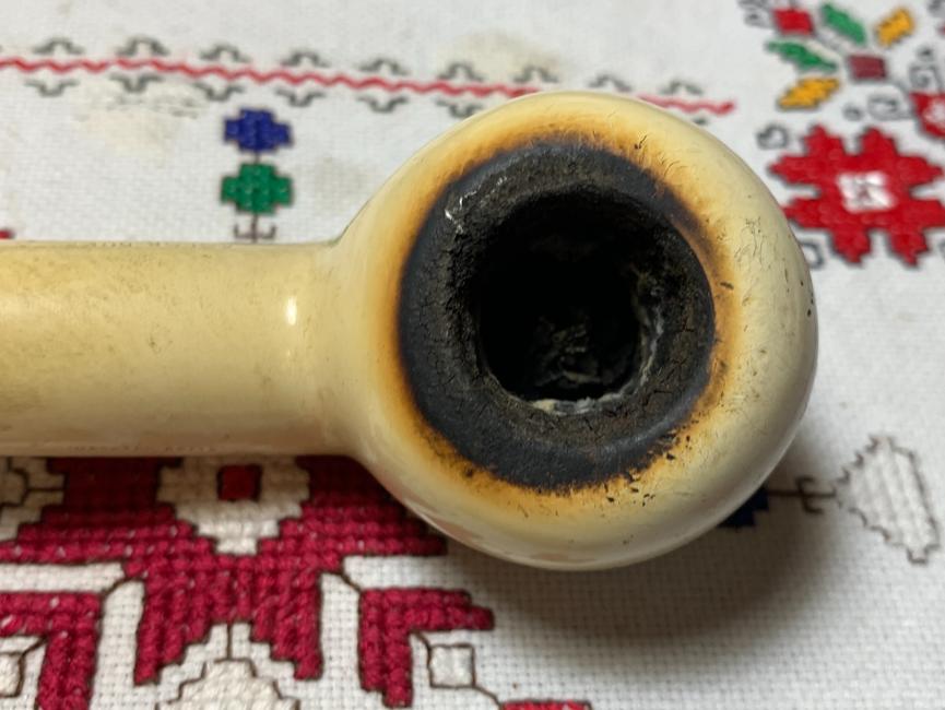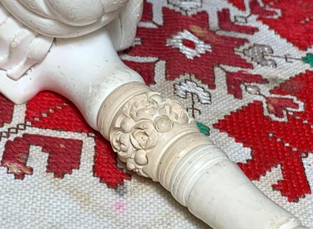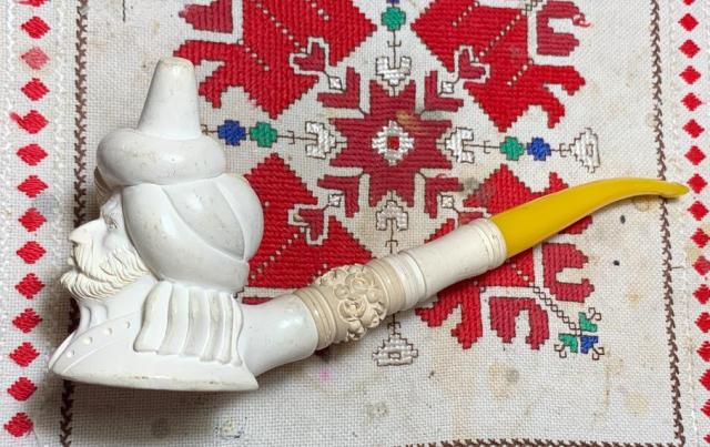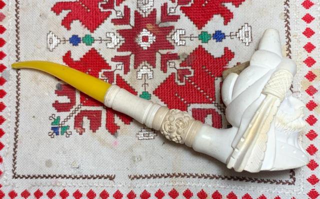 B#8623 Turkish Sultan Meerschaum Churchwarden – There are few words to describe this find at the Knightsbridge Antique Mall in Northville, Michigan. This interesting Sultan doesn’t appear to be old and he hasn’t been smoked. He will difinetly be a conversation starter with these diminsions: Length: 9 3/8 inches, Height: 3 5/8 inches, Chamber width: 7/8 inches, Chamber depth: 2 1/8 inches. The pipe is assembled in 3 pieces – the bowl, long extension and mouth piece.