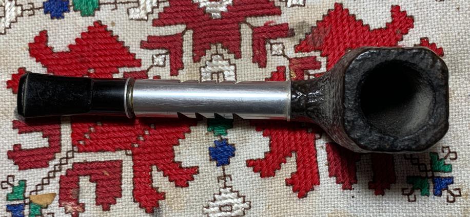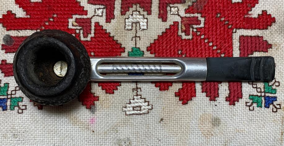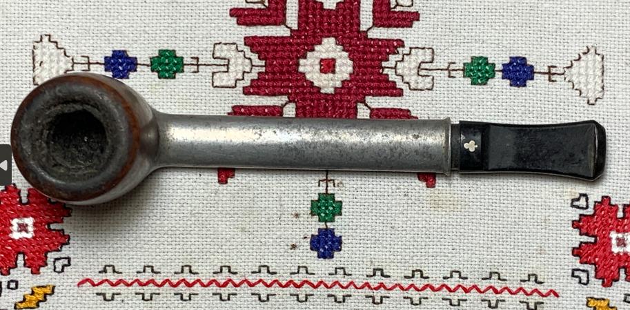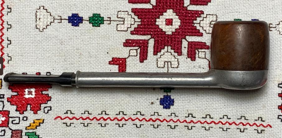 B#8767 Bryson (The) Metal Pipe – This metal pipe was produced in the 1940s. Length: 5 7/8 inches, Height: 1 3/4 inches, Rim width: 1 1/8 inches, Chamber width: 13/16 inches, Chamber depth: 3/4 inches