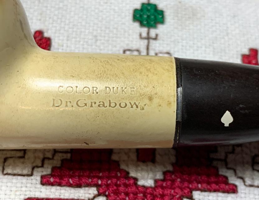 B#8766 Dr. Grabow Color Duke Pat 2461905 White Briar Bent Tomato – Length: 5 1/2 inches, Height: 1 3/8 inches, Rim width: 1 1/4 inches, Chamber width: 3/4 inches, Chamber depth: 1 1/8 inches