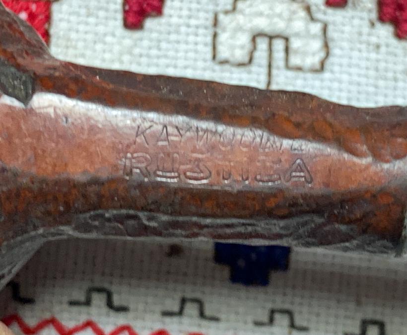 B#8613 Rusticated Slightly Bent Saddle Pickaxe – The unbranded Pickaxe caught my eye at the Solunska Street Antique Store in Sofia, Bulgaria. It has a hefty presence in the palm and ample room in the chamber. Length: 6 3/8 inches, Height: 2 1/2 inches, Rim width: 1 1/2 inches, Chamber width: 7/8 inches, Chamber depth: 1 7/8 inches, Weight: 58g